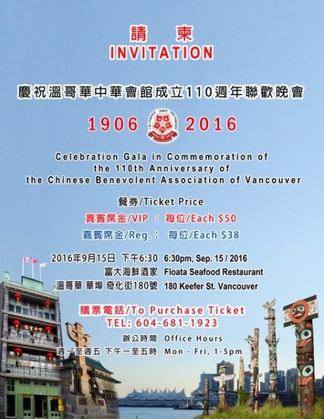 誠摯邀請出席慶祝中華會館110週年暨中秋聯歡晚會。2016年是溫哥華中華會館成立110週年。自會館成立以來,得到華人社團和各界的大力支持,本會館遵照創會宗旨,團結僑社,服務華人社區,為華人在加拿大爭取合法權益,積極促進加中友好往來,堅決支持祖籍國中國捍衛領土主權和平統一。本次慶會有幸邀請到廣東省文化廳組團77人的“絲路粵韻”民樂團,將在宴會上以“歡樂中秋”為主題的精彩表演。