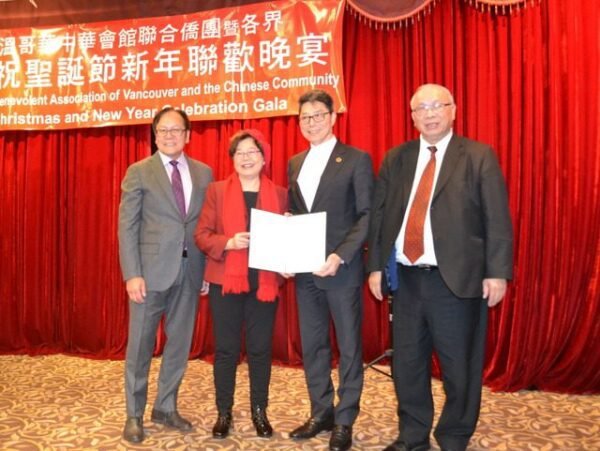 聯邦國會議員黃陳小萍女士(左二)頒感謝狀與溫哥華中華會館理事長姚崇英、副理事長吴俊誉、副理事長朱展倫