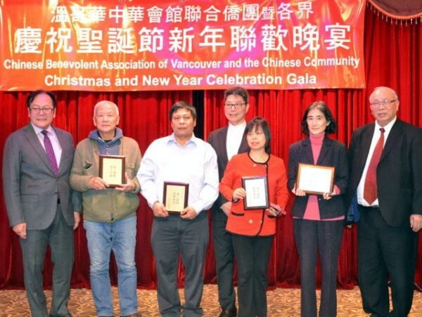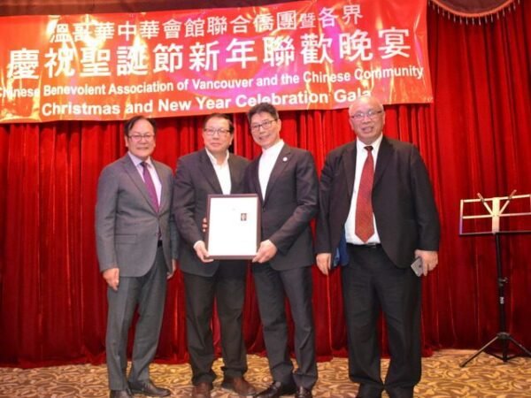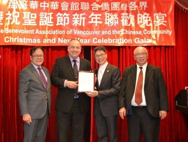 卑詩省議員葉志明請代表(左二)向中華會館頒感謝信