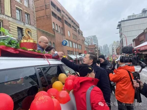 包括联邦保守党党领、卑诗省长、国会议员、省议员、市议员等政要纷纷向沿途围观的民众大派红包,送上新春祝福,现场锣鼓喧天,龙腾狮舞,热闹非凡。