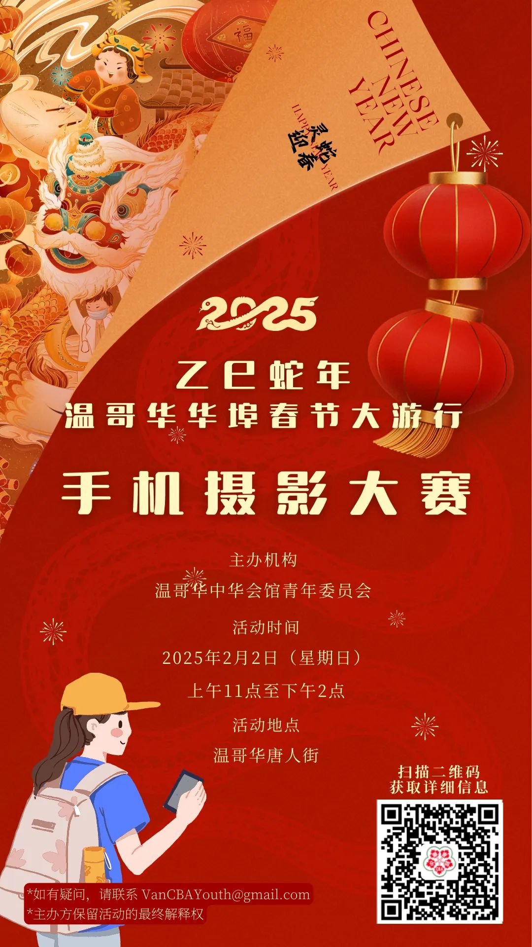 为了庆祝2025年乙巳蛇年春节,同时记录和传承这一珍贵的文化遗产,展示温哥华华埠的多元风采与社区活力,温哥华中华会馆青年委员会特别举办「春节大游行手机摄影大赛」。诚挚邀请民众用手机记录精彩瞬间,用镜头讲述春节的故事,与我们共同守护、弘扬这全球共享的文化财富。所有人均可报名参赛,年龄不限。围绕着春节大游行,捕捉游行的精彩画面、节庆氛围及社区文化,展现春节作为非物质文化遗产的独特魅力。